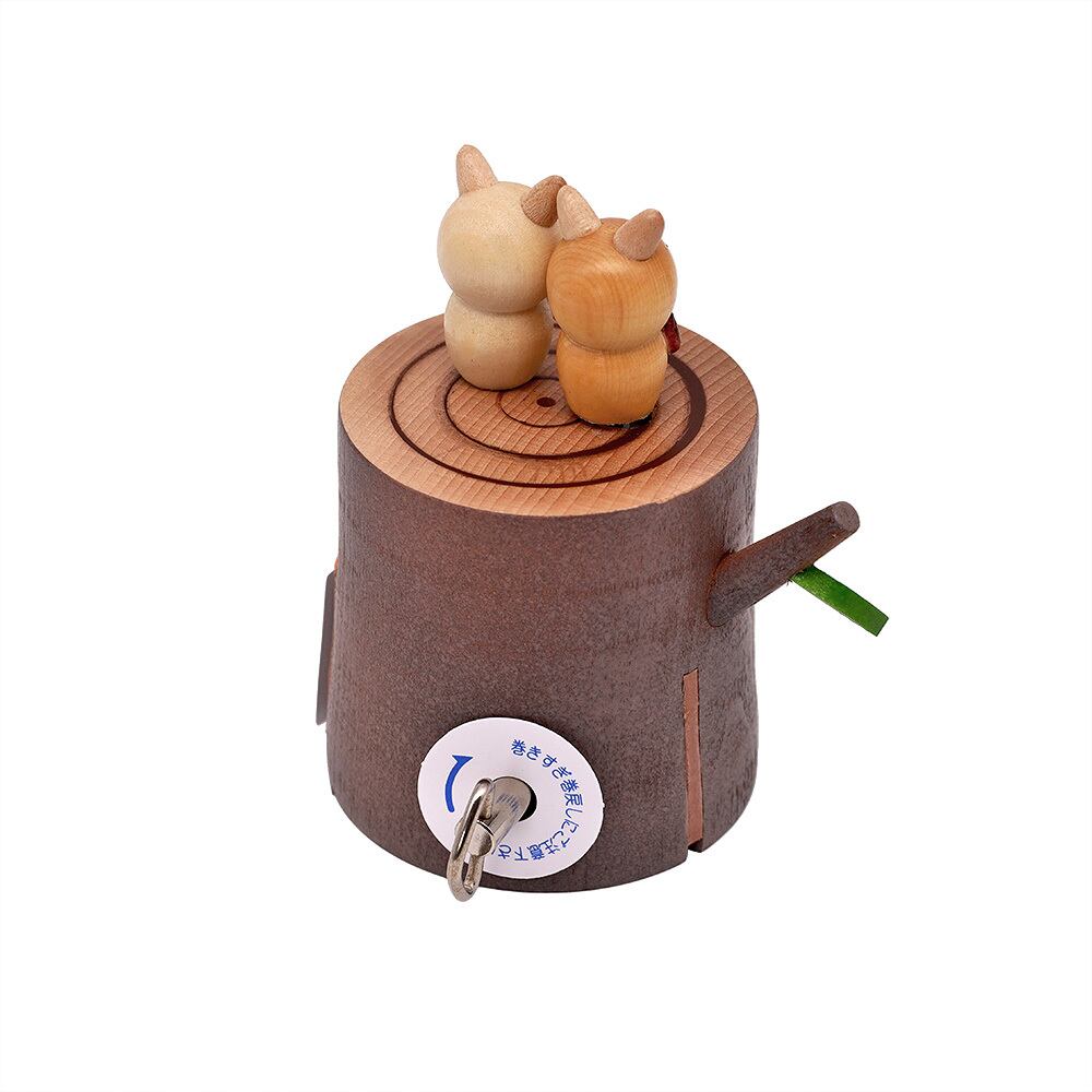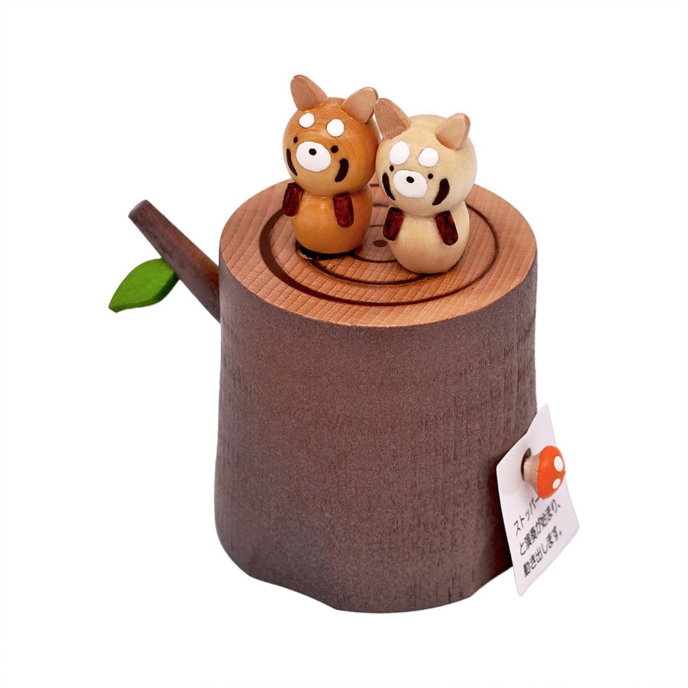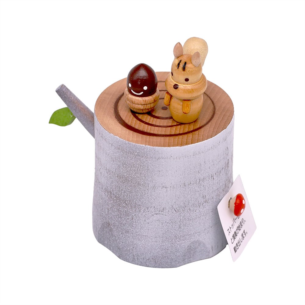 木の切り株にちょこんとのった小さな動物たちが、オルゴールの曲に合わせて回転します。